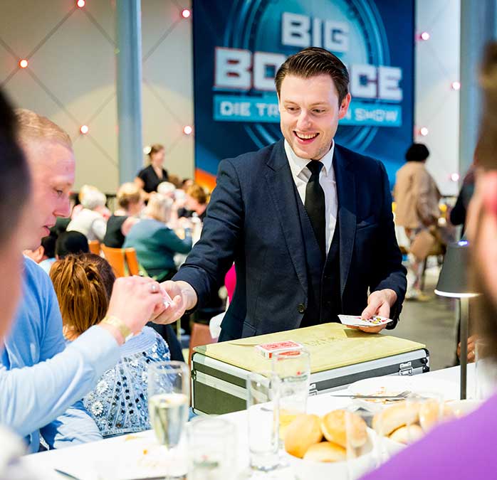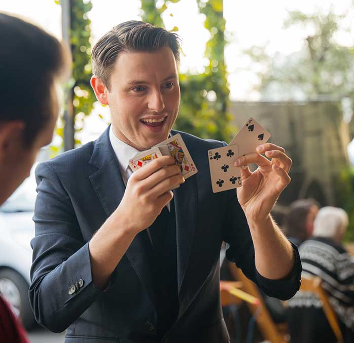 Tafelgoochelen is een vorm van entertainment die waarde toevoegt aan elk evenement. Je gasten ervaren de magie letterlijk onder hun neus. Dichterbij dan dit kan niet! En toch kun je nog steeds niet ontdekken hoe deze kleine wonderen gebeuren. Met behulp van dagelijkse voorwerpen van toeschouwers of gewoon een spel kaarten, entertaint Brandon je gasten op humoristische en interactieve wijze. Dit geeft een magisch tintje aan je evenement, verbindt mensen en werkt perfect als ijsbreker of aanvulling op de avond. Er zijn eindeloze mogelijkheden! Het is gewoon een kwestie van: Wat, Waar en Wanneer?